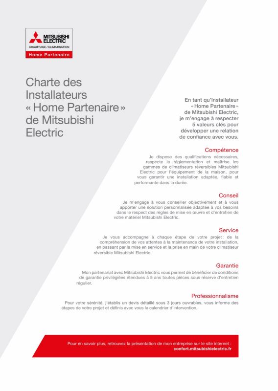 Faire appel à un professionnel qualifié est essentiel pour garantir la longévité de votre équipement. Suite à un cursus de formation technique rigoureux, notre équipe est officiellement agréée Home Partenaire Mitsubishi Electric. Cette distinction est un gage de confiance qui vous offre des avantages exclusifs :